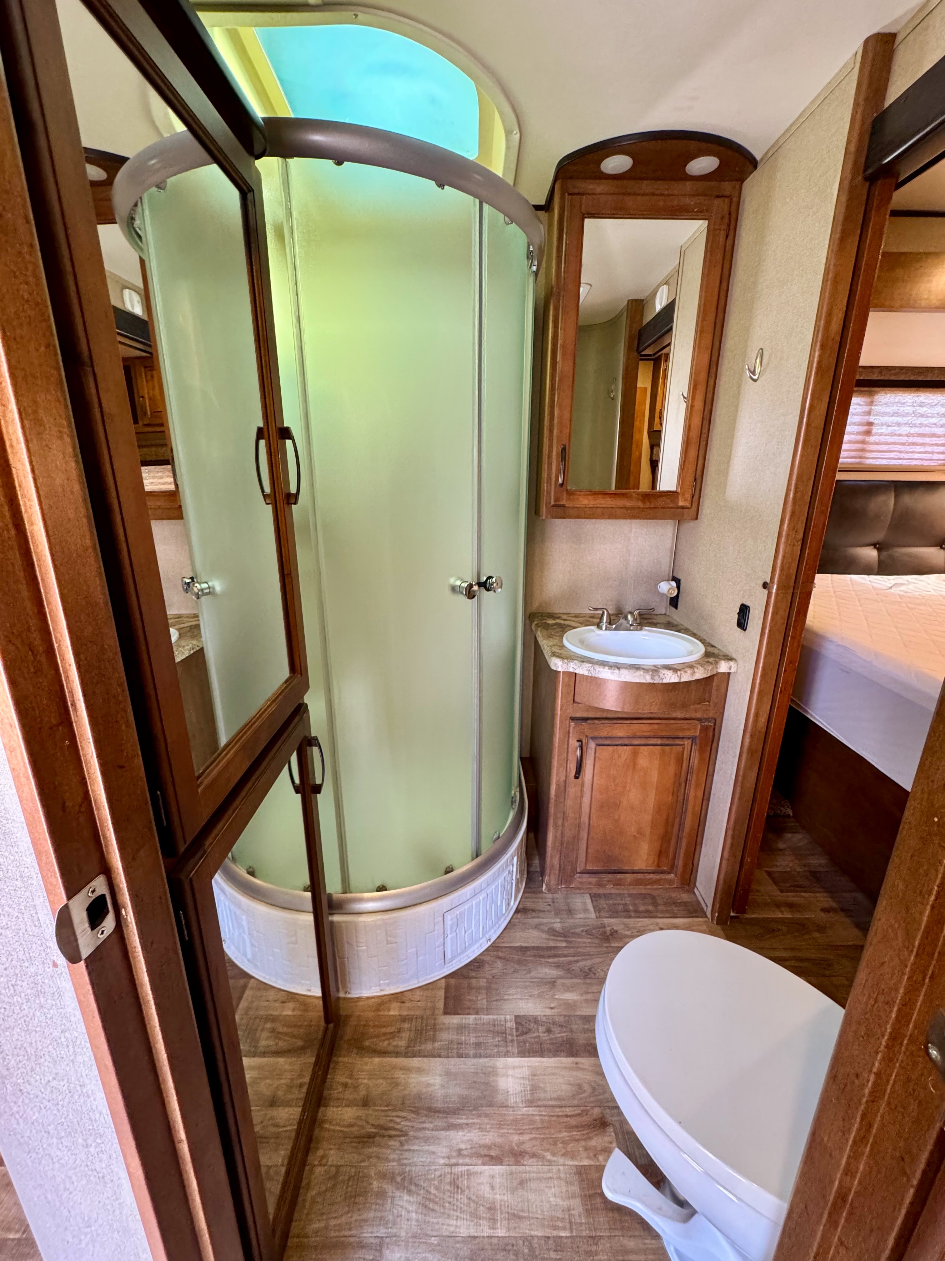 - Spacious Bathroom – Walk-in shower with glass doors, toilet, vanity, and linen storage