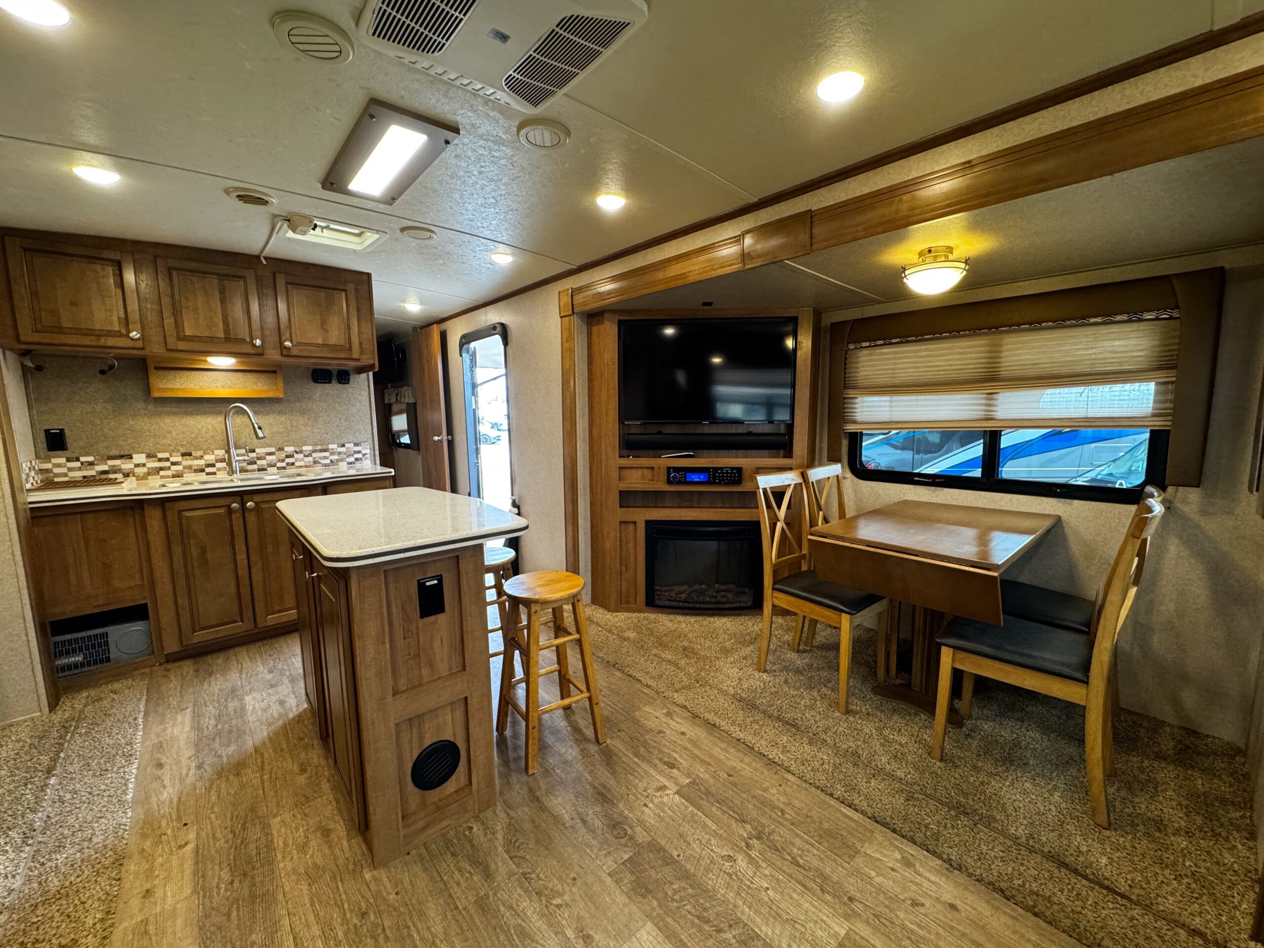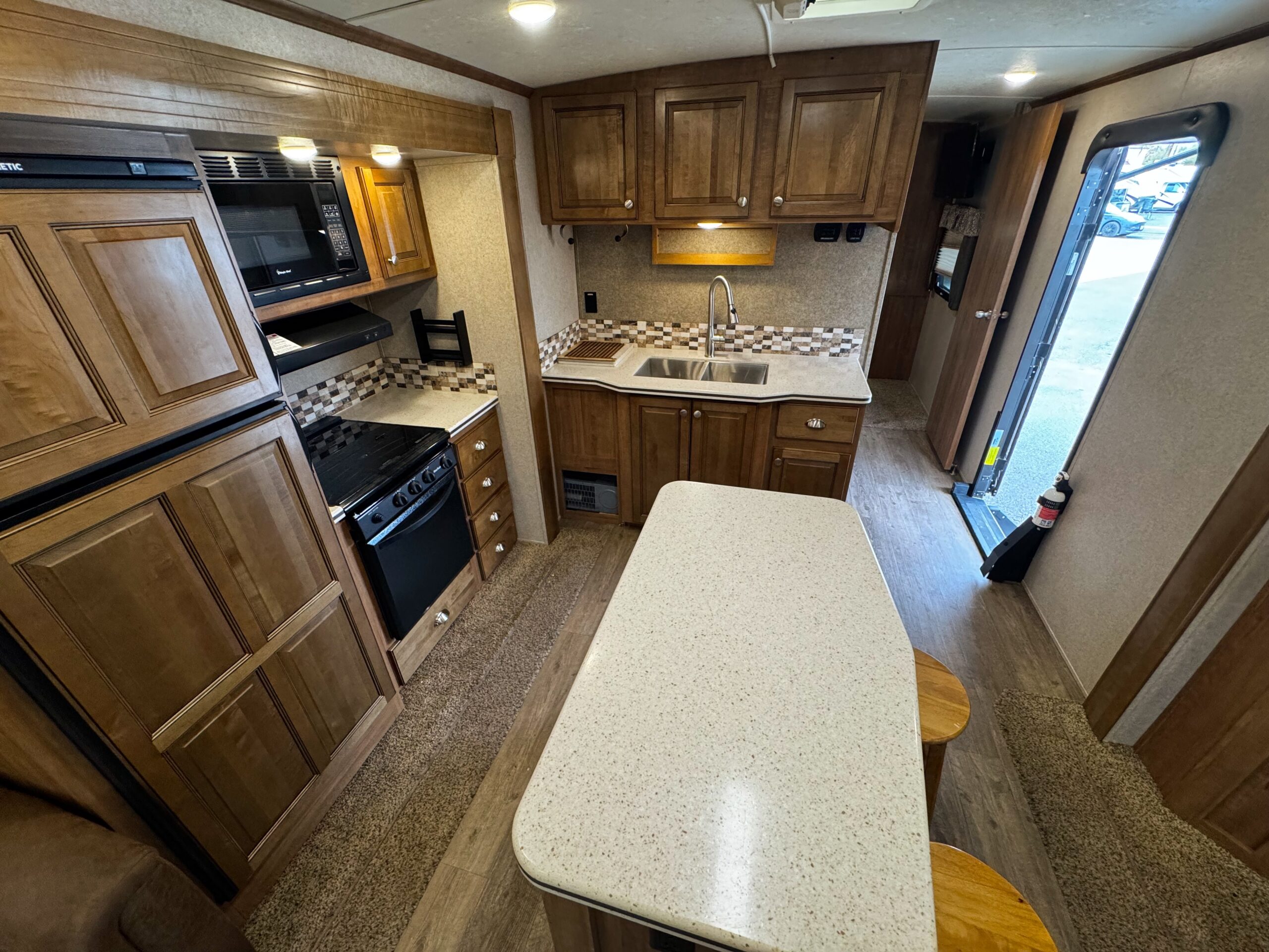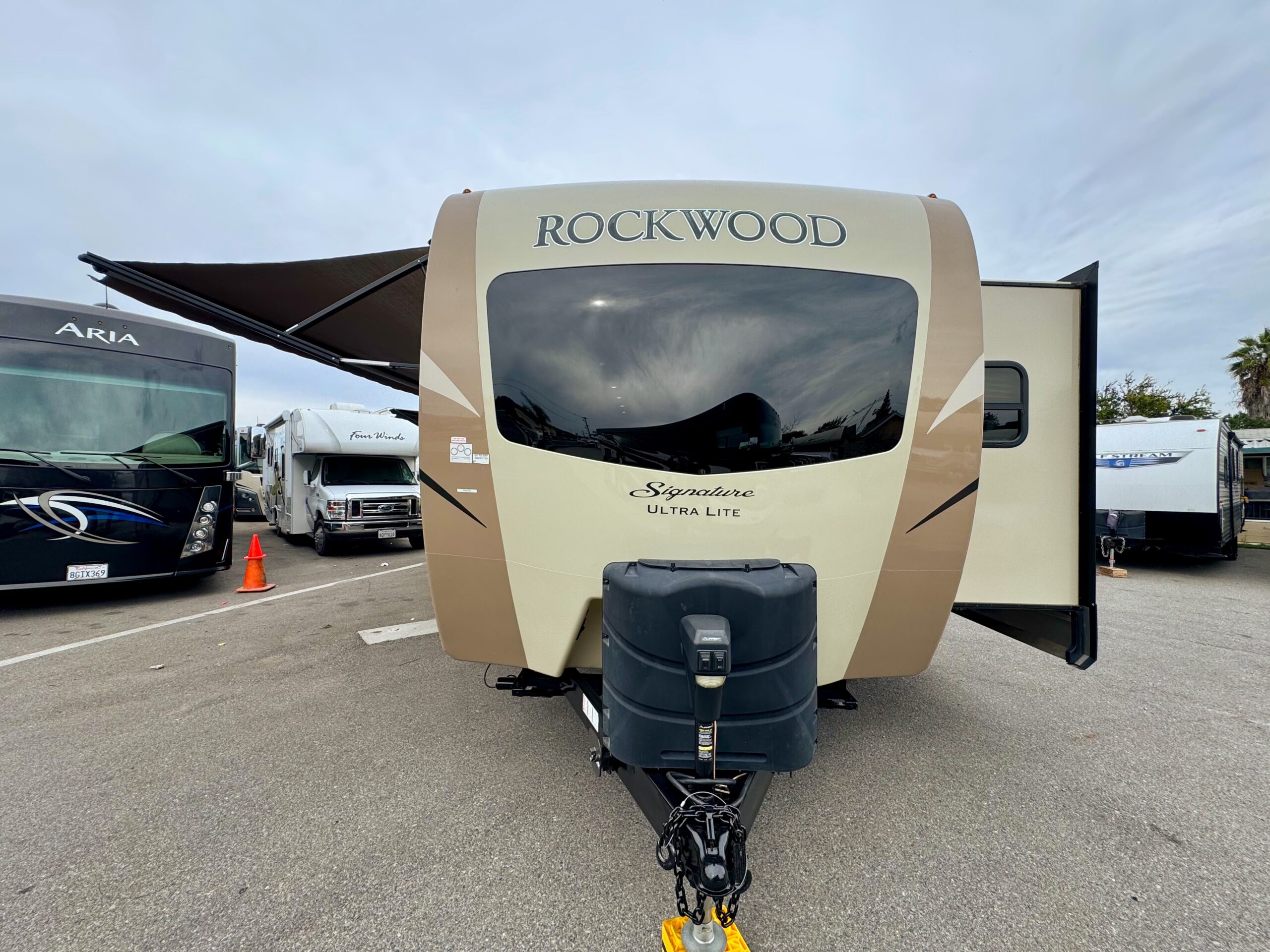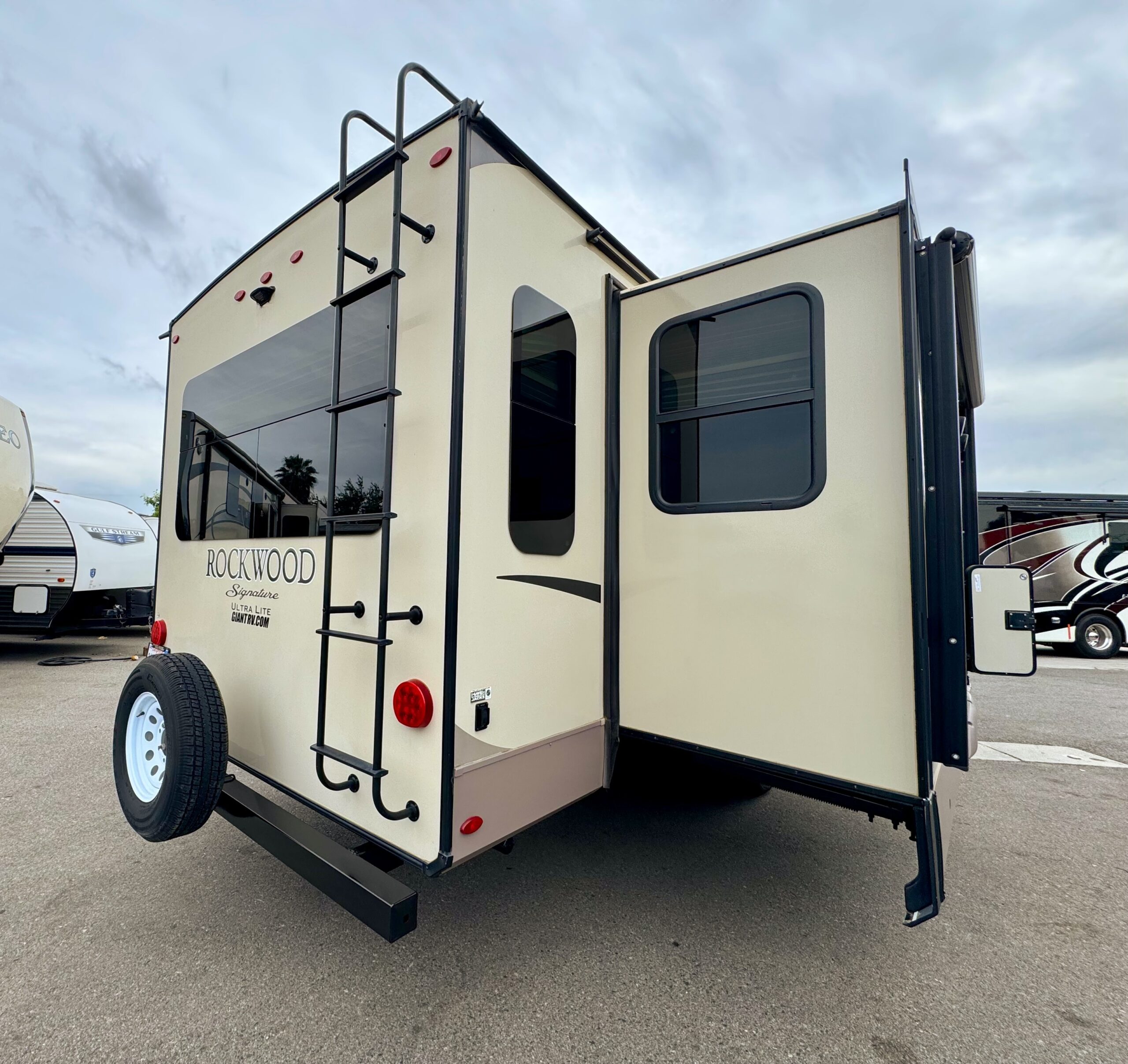 The interior features inviting seating, large windows for natural light, and Rockwood’s renowned craftsmanship. The kitchen is thoughtfully laid out with ample counter space, generous storage, and residential-style appliances. A private front bedroom and a roomy bathroom complete the layout, making this RV both functional and comfortable.