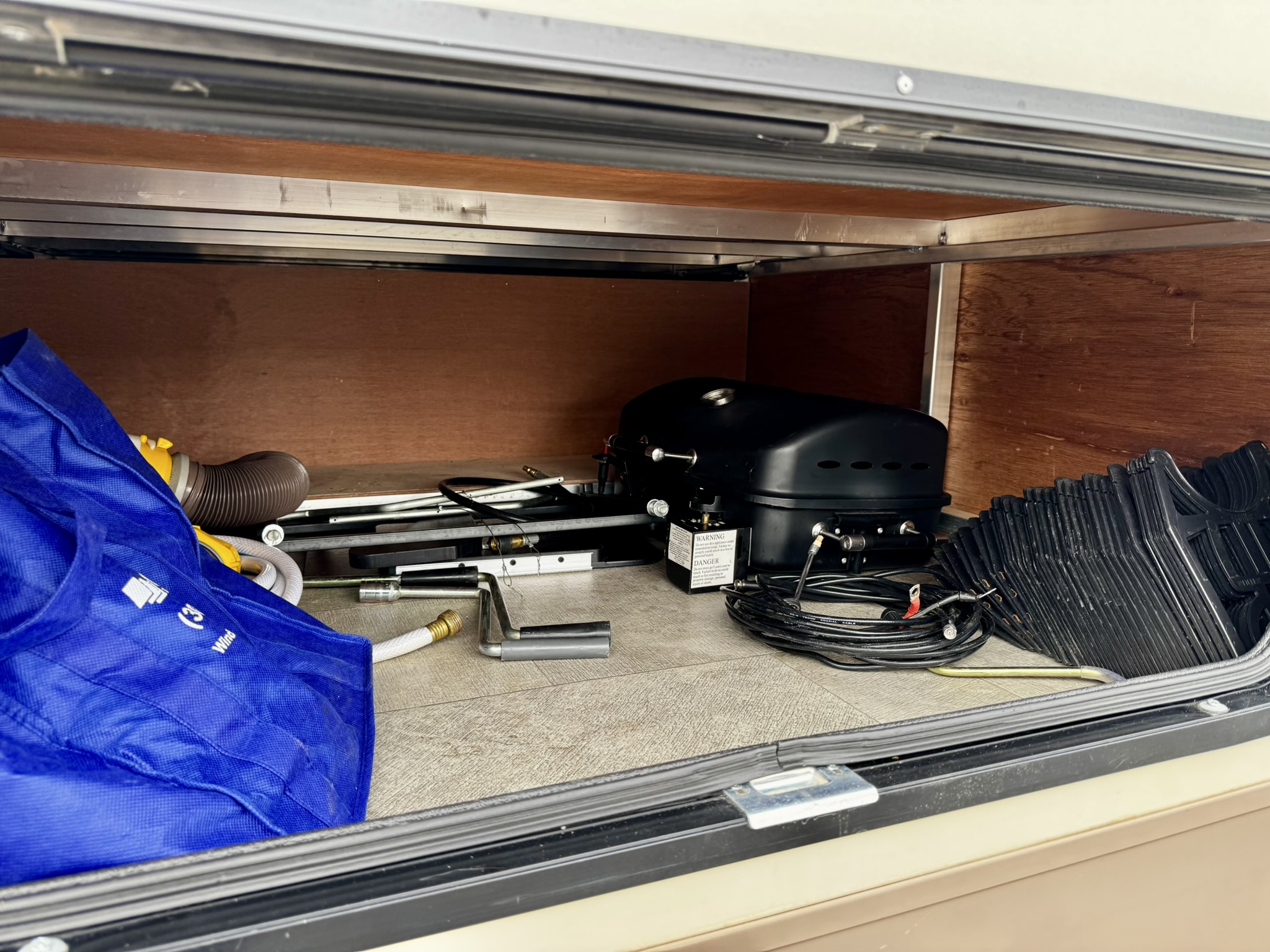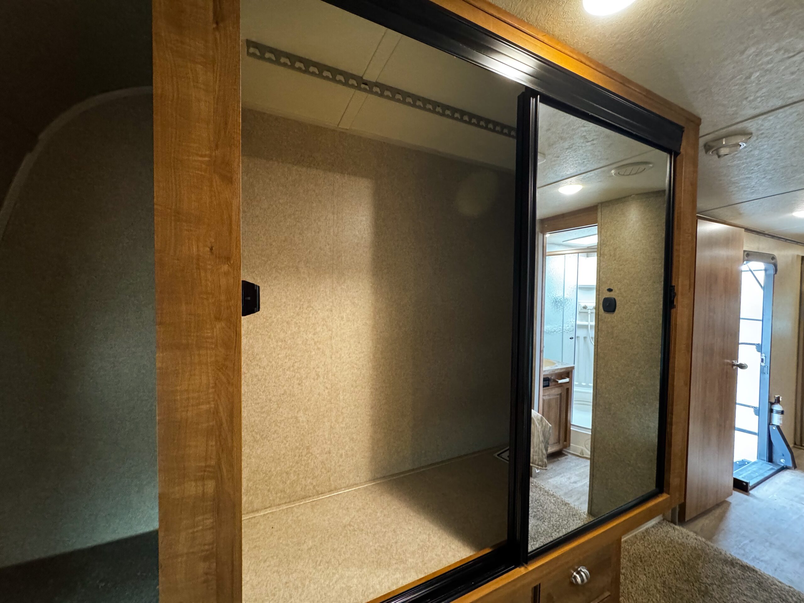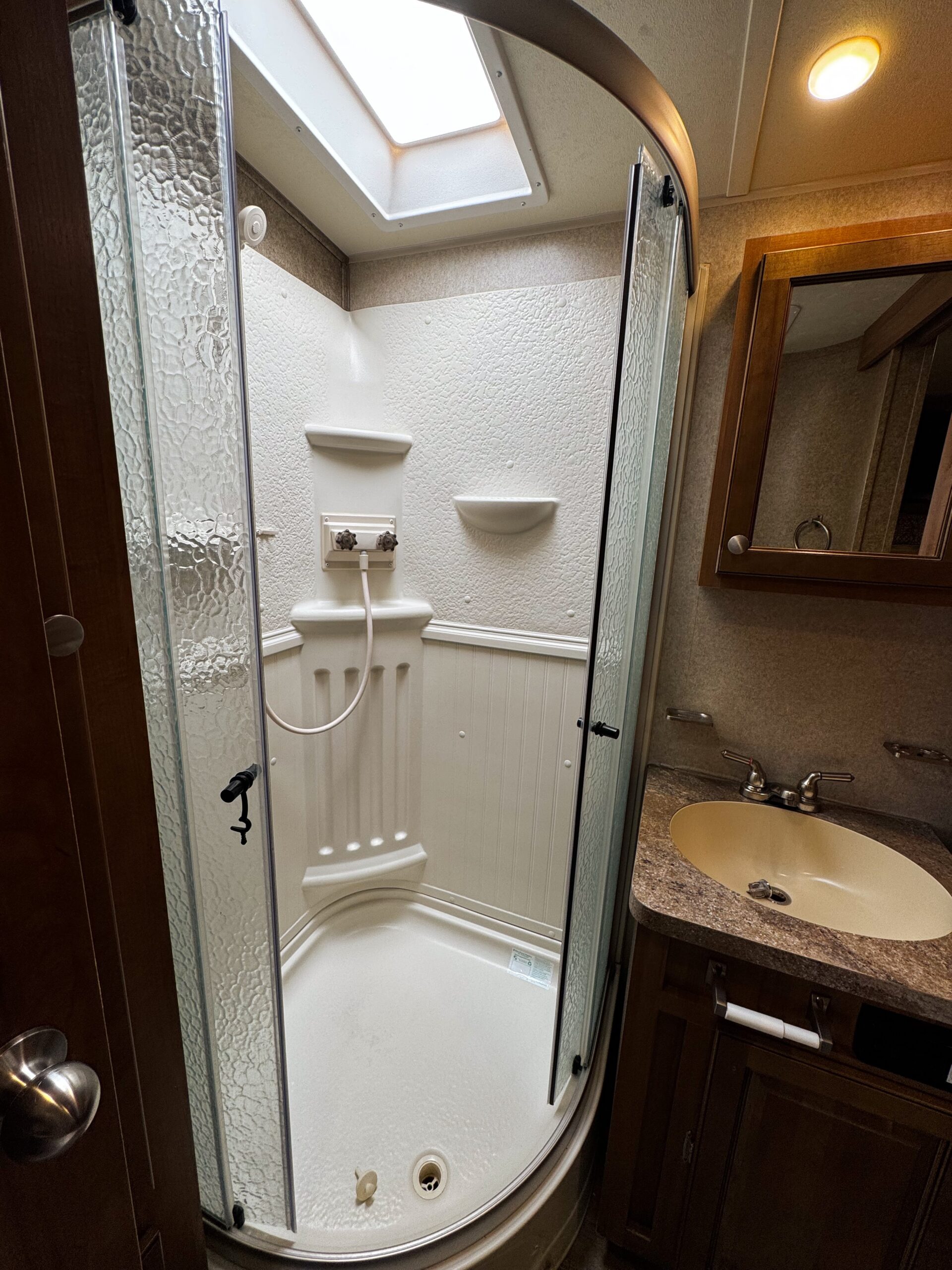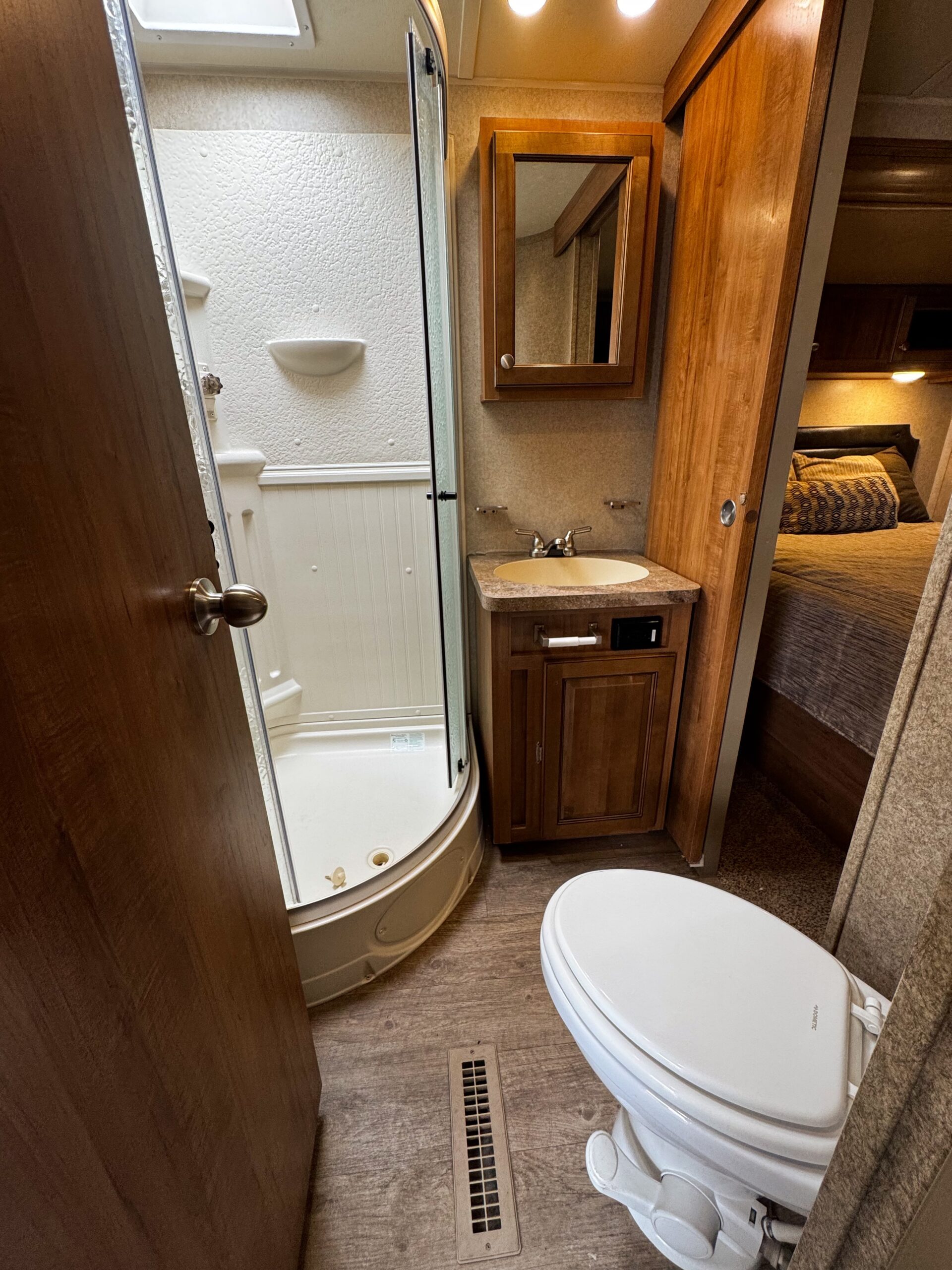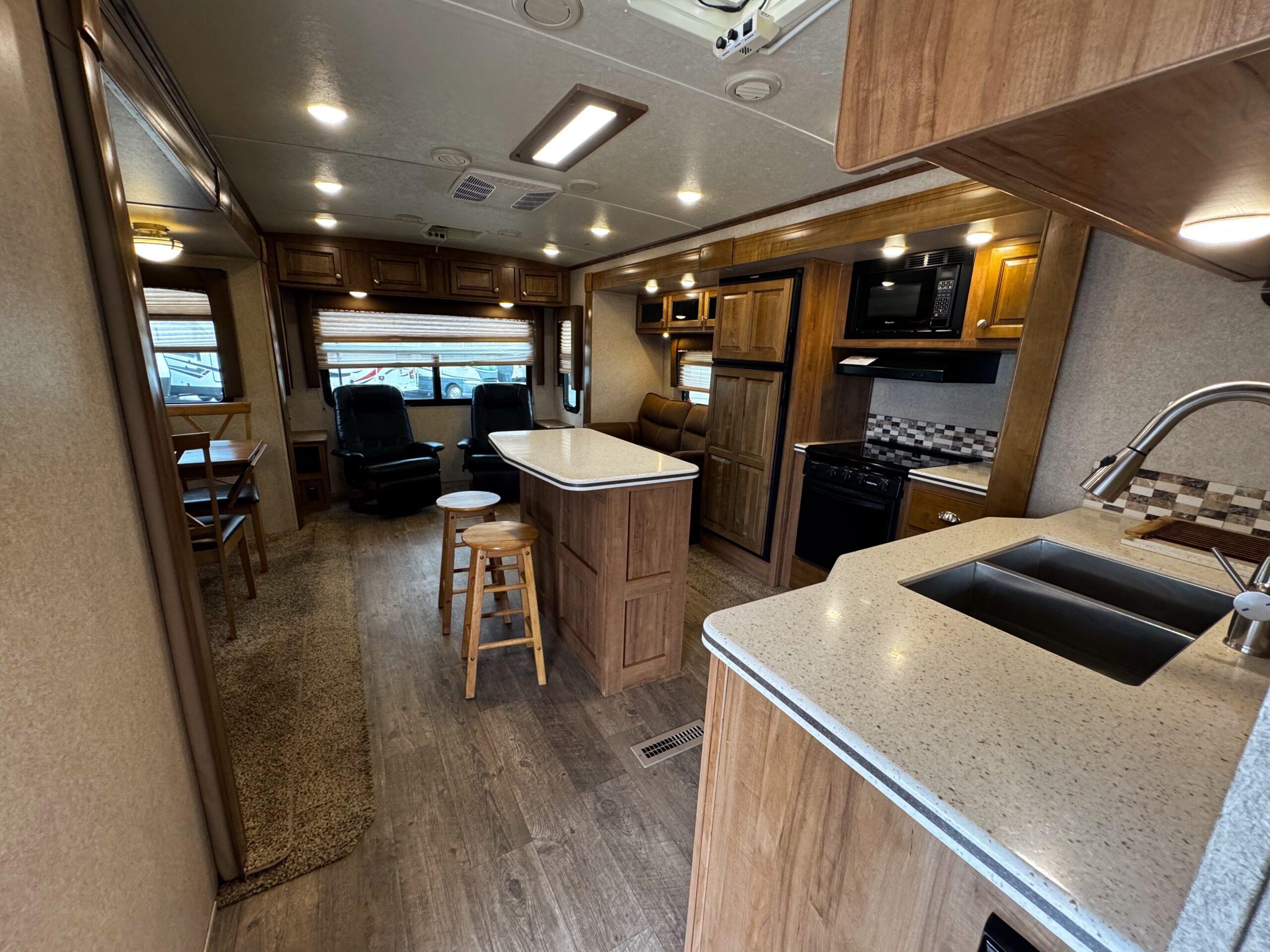 The interior features inviting seating, large windows for natural light, and Rockwood’s renowned craftsmanship. The kitchen is thoughtfully laid out with ample counter space, generous storage, and residential-style appliances. A private front bedroom and a roomy bathroom complete the layout, making this RV both functional and comfortable.